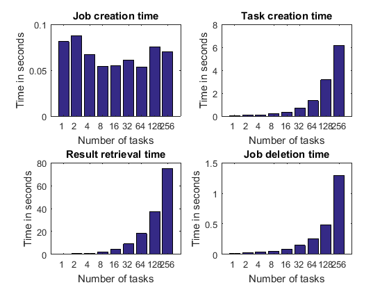 ジョブ作成時間: ジョブを作成するための時間。MATLAB ジョブ スケジューラ クラスターの場合、これにはリモート呼び出しが必要であり、MATLAB ジョブ スケジューラによってデータベースに領域が割り当てられます。他のタイプのクラスターの場合、ジョブの作成ではいくつかのファイルをディスクに書き込む必要があります。