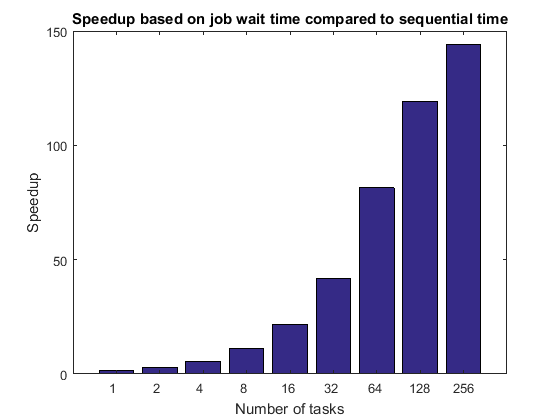 titleStr = 'Speedup based on job wait time compared to sequential time'; pctdemo_plot_distribjob('speedup', [weak.numTasks], [weak.jobWaitTime], ... seqTime, titleStr);