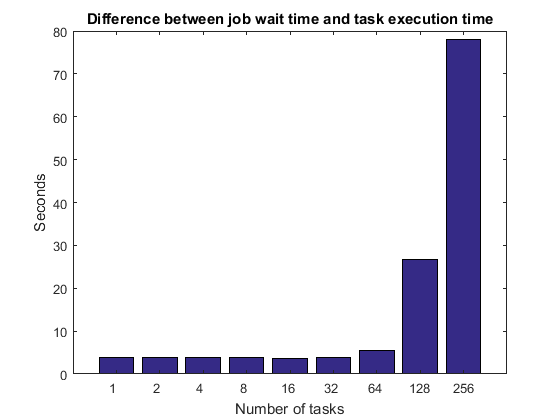 titleStr = 'Difference between job wait time and task execution time'; pctdemo_plot_distribjob('barTime', [weak.numTasks], ... [weak.jobWaitTime] - [weak.exeTime], titleStr);
