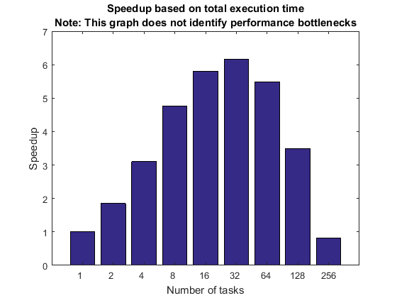 titleStr = sprintf(['Speedup based on total execution time\n' ... 'Note: This graph does not identify performance ' ... 'bottlenecks']); pctdemo_plot_distribjob('speedup', [strong.numTasks], ... [strong.totalTime].*[strong.numTasks], strong(1).totalTime, titleStr);