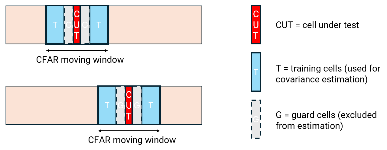 Training cells dynamically adjust with the CUT position, maintaining a symmetric window around it. Guard cells isolate the CUT from training regions to prevent contamination. This method ensures target-free training and the proximity of training cells to the CUT improves noise covariance accuracy. However, this method leads to higher computational cost in the ACE detector due to repeated covariance updates for each CUT.