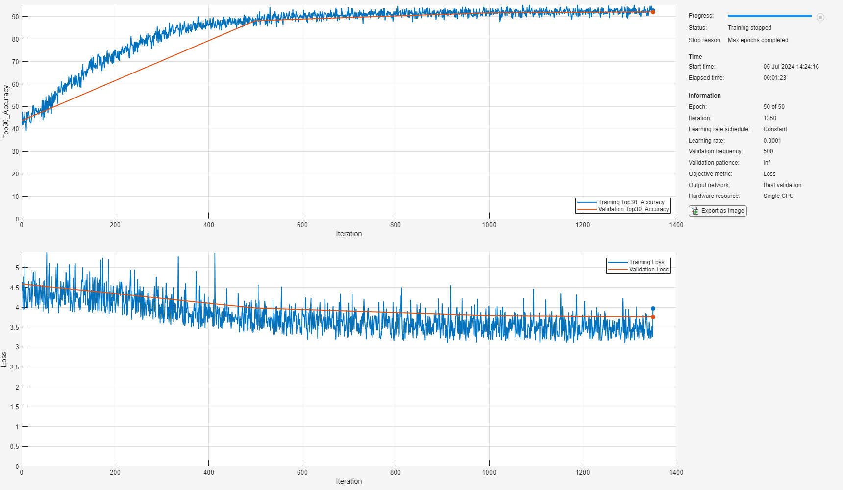 ネットワークが学習データに過適合するのを避けるため、maxEpochs を 50、InitialLearnRate を 1e-4 に設定します。accuracyMetric (Deep Learning Toolbox)オブジェクトを使用し、NumTopKClasses を 30 に設定して、学習中に上位 30 位のビームの精度をプロットします。