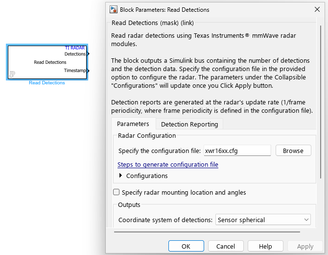 For example, if you want to read detections from a TI radar sensor, you can use the Read Detections available in the support package. To do this, follow the steps below.