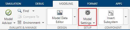 1. In your Simulink model, open the Configuration Parameters dialog by selecting the Modeling tab and clicking Model Settings, or by pressing Ctrl+E.
