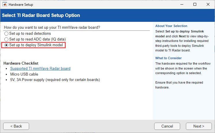To model, build, and deploy applications using the Radar Toolbox Support Package for Texas Instruments® mmWave Radar Sensors, you must install additional third-party software. The hardware setup process guides you through these installation steps.