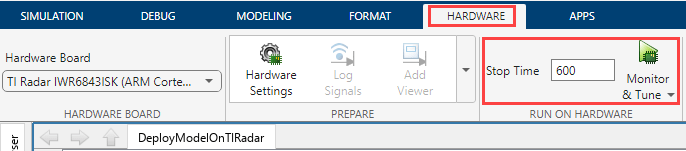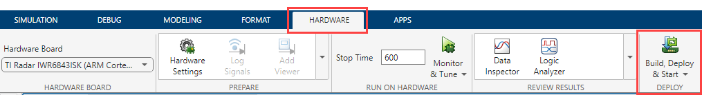 • Build and deploy the Simulink model to the ARM Cortex core of the TI Radar board.