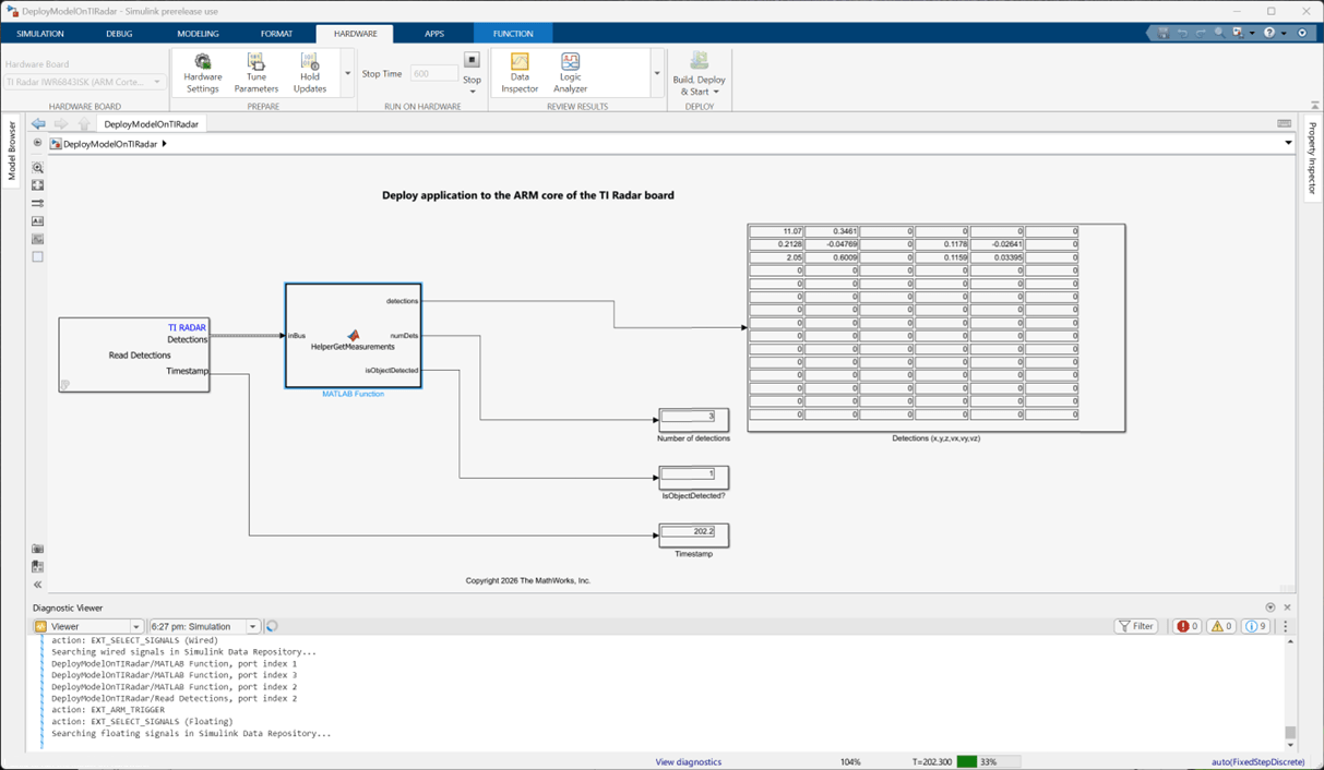 Once you have completed these steps as prompted by the hardware setup screens, the code generated from your model will begin running on the TI Radar device.