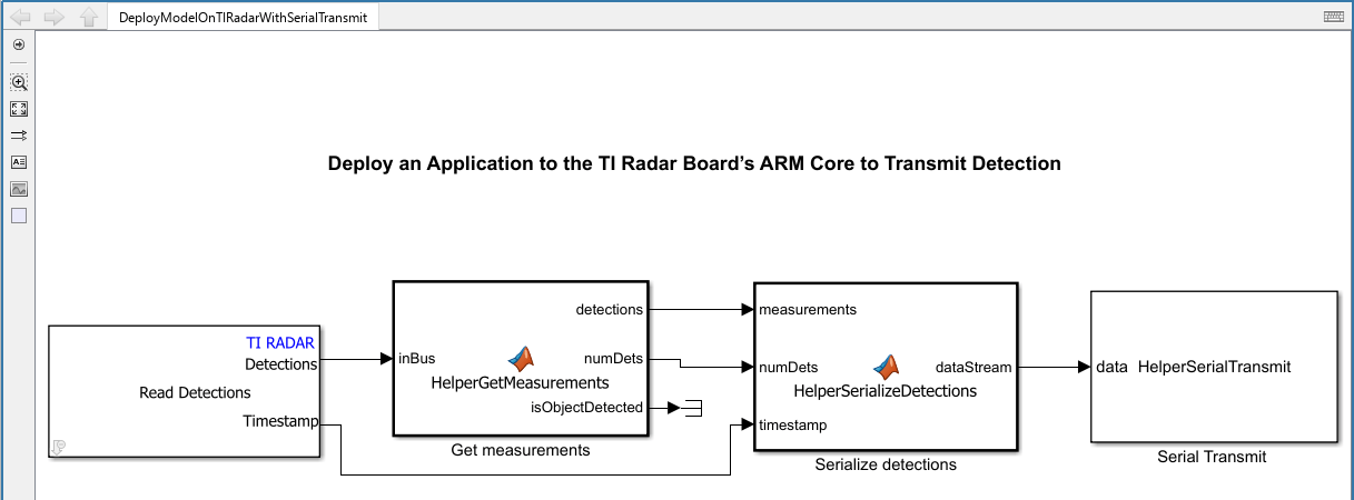 This section guides you through the steps to deploy a Simulink model to TI mmWave Radar board and transmit application data over the serial interface. The example includes another model that includes blocks for data serialization and UART transmission.