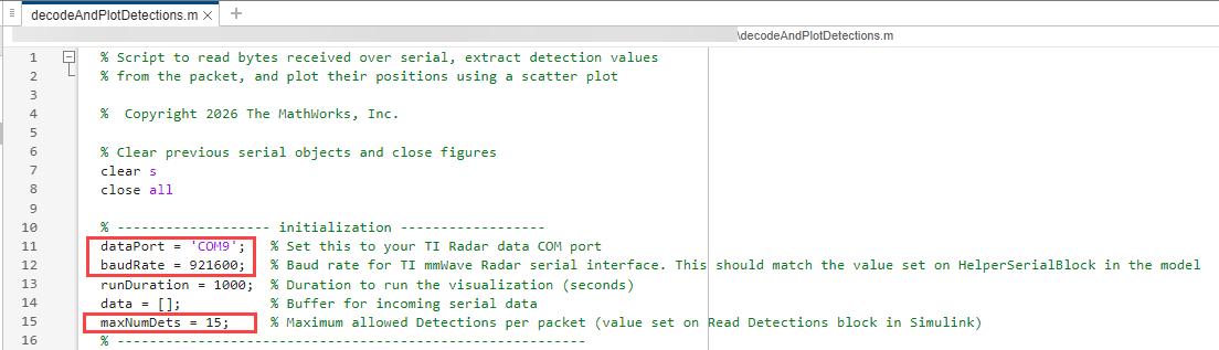 • Adjust the dataport parameter in the decodeAndPlotDetections.m script to match the host computer's data port. For details, refer to Identifying Serial Ports for TI mmWave Radar Connection.