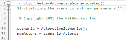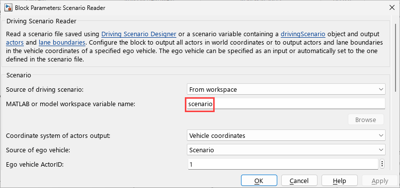 The Workspace variable scenario is generated using the helper function helperAutomativeScenarioSetup, and it used in the Scenario Reader block in the model.