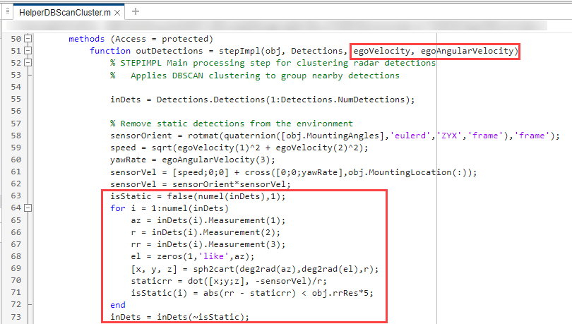 The helper function HelperDBScanCluster also removes the static clutter that is present in the scenario, so that the object-level detections also include velocity and angular velocity of the ego vehicle, and not the guard rails present in the scenario.