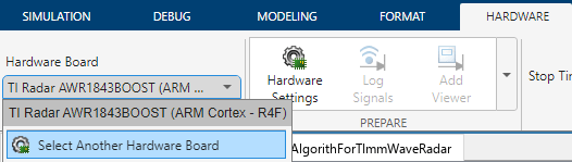 2. In the Hardware tab, select the same board from the list (click Select Another Hardware Board and select the supported board, if you are not using AWR1843BOOST). Ensure that you select the correct board in both PILVerificationofTrackingAlgorithForTImmWaveRadar.slx (top model) and in TrackingAlgorithm.slx (referenced model).