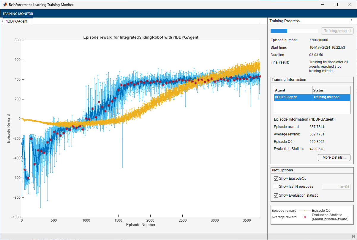 maxepisodes = 10000; maxsteps = ceil(Tf/Ts); trainingOptions = rlTrainingOptions(... MaxEpisodes=maxepisodes,... MaxStepsPerEpisode=maxsteps,... StopOnError="on",... Verbose=false,... Plots="training-progress",... StopTrainingCriteria="EvaluationStatistic",... StopTrainingValue=425,... ScoreAveragingWindowLength=10); % agent evaluator evl = rlEvaluator(EvaluationFrequency=50,NumEpisodes=5);
