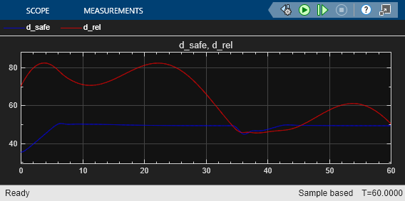 自車の基準速度 を次のように定義する。相対距離が安全距離未満の場合、自車は先行車両の速度と運転手が設定した速度の最小値に追従する。この方法により、自車は先行車両からある程度の距離を維持する。相対距離が安全距離より大きい場合、自車は運転手が設定した速度に追従する。この例では、安全距離は自車の縦方向の速度 の線形関数、つまり、 として定義される。安全距離によって、自車の追従速度が決まる。