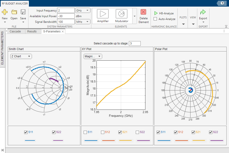 To visualize cascade network and plot S-parameters at each stage, use the RF Budget Analyzer app. Type the rfBudgetAnalyzer(CascadedBudget) command at the command line.