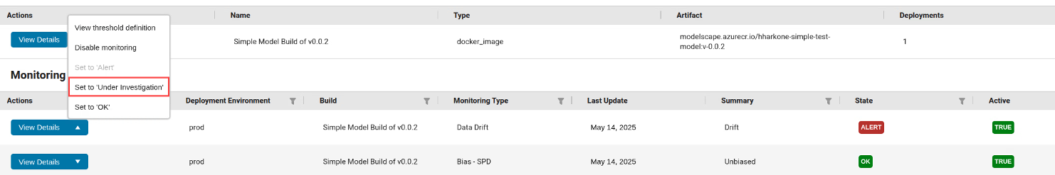 Under Investigation. Click the drop-down arrow in the Actions column, then click Set to 'Under