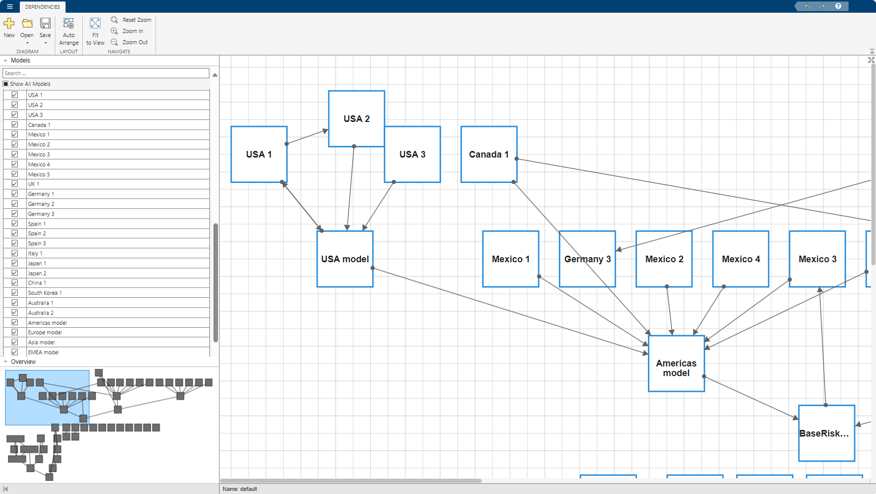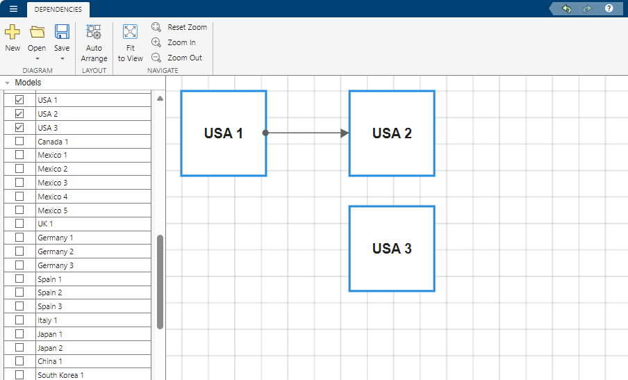 You see a diagram displaying your models and the dependencies between them. For example, an arrow pointing from USA 1 to USA 2 indicates that the outputs from USA 1 are inputs of USA 2.