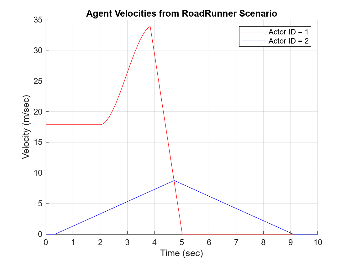 figure hold on plot(time,velMagAgent1,"r") plot(time,velMagAgent2,"b") grid on title("Agent Velocities from RoadRunner Scenario") ylabel("Velocity (m/sec)") xlabel("Time (sec)") legend("Actor ID = 1","Actor ID = 2")