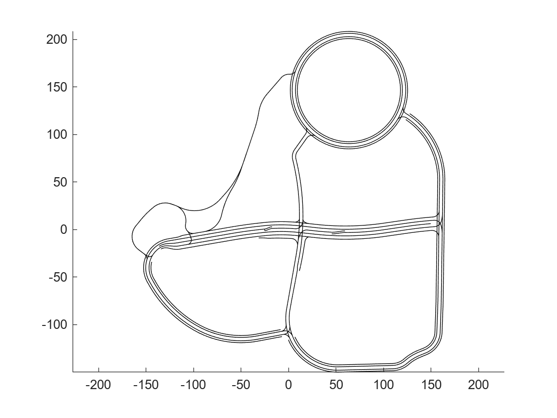 figure hold on for i = 1:numel(lanes) control_points = lanes(i).geometry.values; x_coordinates = arrayfun(@(cp) cp.x,control_points); y_coordinates = arrayfun(@(cp) cp.y,control_points); plot(x_coordinates,y_coordinates,"black"); end axis equal
