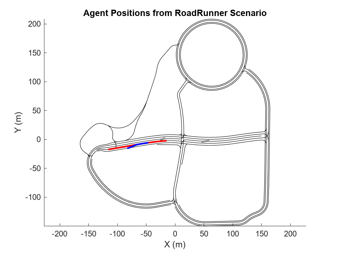 poseActor1 = get(simLog,"Pose","ActorID",1); positionActor1_x = arrayfun(@(x) x.Pose(1,4),poseActor1); positionActor1_y = arrayfun(@(x) x.Pose(2,4),poseActor1); plot(positionActor1_x,positionActor1_y,"r",LineWidth=2) poseActor2 = get(simLog,"Pose","ActorID",2); positionActor2_x = arrayfun(@(x) x.Pose(1,4),poseActor2); positionActor2_y = arrayfun(@(x) x.Pose(2,4),poseActor2); plot(positionActor2_x,positionActor2_y,"b",LineWidth=2) title("Agent Positions from RoadRunner Scenario") ylabel("Y (m)") xlabel("X (m)")