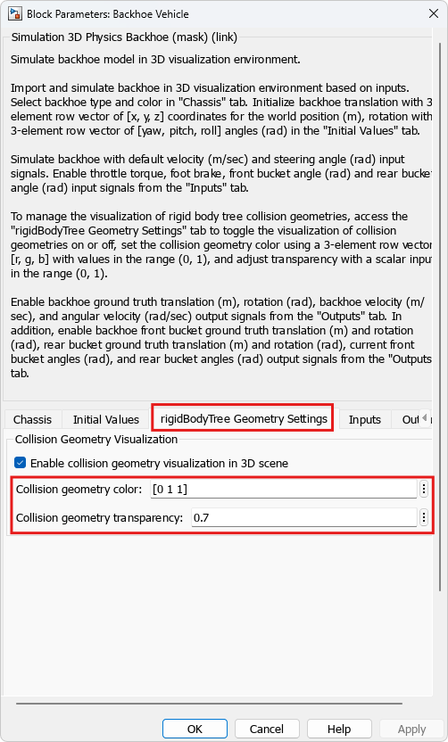 To enable rigidBodyTree collision geometry visualization in Unreal, perform following setting in the rigidBodyTree Collision Settings tab from the Simulation 3D Physics Dump Truck and Simulation 3D Physics Backhoe blocks. Further, modify rigidBodyTree collision geometry color and transparency by specifying values in the Collision geometry color and Collision geometry transparency field.