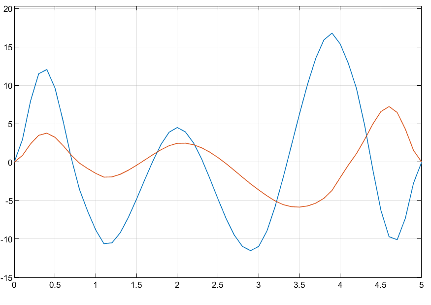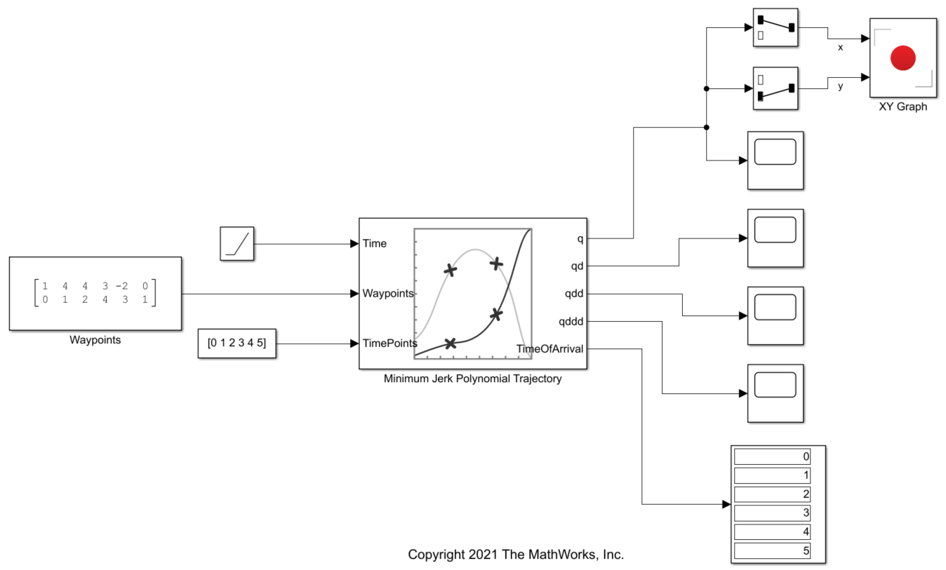 このモデルには、Minimum Jerk Polynomial Trajectory ブロックの "Waypoints" 端子に 6 個の 2 次元ウェイポイントを指定する Constant ブロック Waypoints と、"TimePoints" 端子にそれらのウェイポイントそれぞれの時間点を指定する別の Constant ブロックが含まれています。"Time" 端子への入力は、時間の進行をシミュレーションするためのランプ信号です。