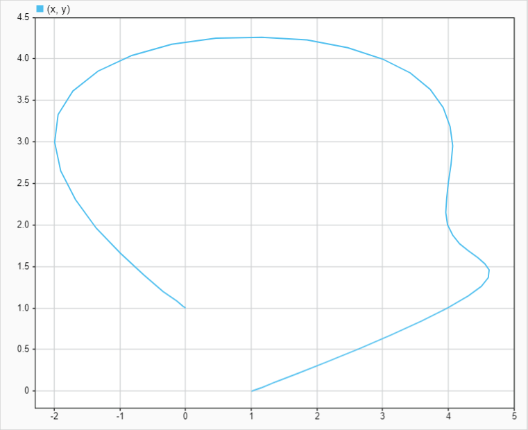 XY グラフには実際の 2 次元軌跡が示されています。この軌跡は定義された制御点の範囲内に留まり、最初と最後のウェイポイントに到達しています。