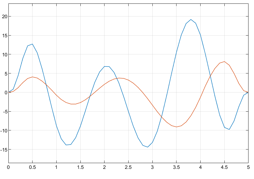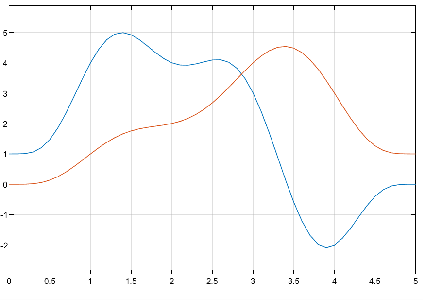 このモデルには、Minimum Jerk Polynomial Trajectory ブロックの "Waypoints" 端子に 6 個の 2 次元ウェイポイントを指定する Constant ブロック Waypoints と、"TimePoints" 端子にそれらのウェイポイントそれぞれの時間点を指定する別の Constant ブロックが含まれています。"Time" 端子への入力は、時間の進行をシミュレーションするためのランプ信号です。