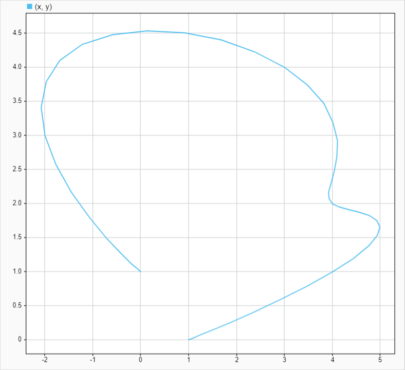 XY グラフには実際の 2 次元軌跡が示されています。この軌跡は定義された制御点の範囲内に留まり、最初と最後のウェイポイントに到達しています。