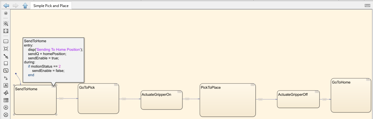 In this example, a Stateflow chart is used to design a pick-and-place operation, and it includes states, transitions, and actions in the following sequence: