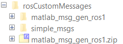 ROS カスタム メッセージは、msg という名前のフォルダーを含む ROS パッケージ フォルダー内に指定されます。msg フォルダーには、すべてのカスタム メッセージ タイプ定義が含まれています。たとえば、rosCustomMessages フォルダーにある simple_msgs パッケージのフォルダーとファイルの構造は次のとおりです。