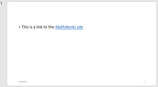 import mlreportgen.ppt.* ppt = Presentation("myPresentation3.pptx"); open(ppt); add(ppt,"Title and Content"); p = Paragraph("This is a link to the "); link = ExternalLink("https://www.mathworks.com","MathWorks site"); append(p,link); replace(ppt,"Content",p); close(ppt); rptview(ppt);
