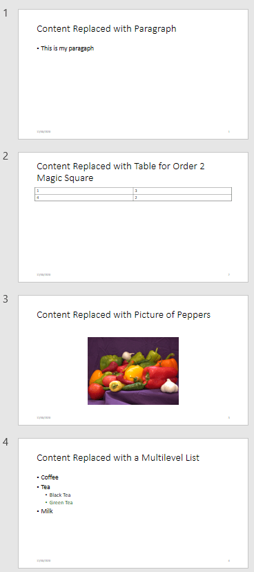 replace( は、コンテンツ プレースホルダーのコンテンツを複数の段落に置き換えます。contentPlaceholder,paragraphs)