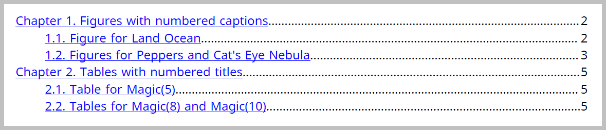 % Chapter 1. chapterTitle = getChapterTitle("Figures with numbered captions"); append(d,chapterTitle); % Section 1.1. sectionTitle = getSectionTitle("Figure for Land Ocean"); append(d,sectionTitle); % Figure 1.1. image1 = Image(which("landOcean.jpg")); image1.Style = imageStyle; append(d,image1); append(d,getFigureCaption("Land Ocean")); % Section 1.2. sectionTitle = getSectionTitle("Figures for Peppers and Cat's Eye Nebula"); append(d,sectionTitle); % Figure 1.2. image2 = Image(which("peppers.png")); image2.Style = imageStyle; append(d,image2); append(d,getFigureCaption("Peppers")); % Figure 1.3. image3 = Image(which("ngc6543a.jpg")); image3.Style = imageStyle; append(d,image3); append(d,getFigureCaption("Cat's Eye Nebula or NGC 6543"));