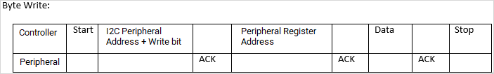 次のイメージは、I2C 周辺デバイスに存在するレジスタ上のシングル バイトの読み取りおよび書き込みを示しています。
