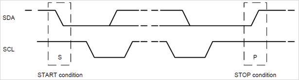 SCL が HIGH の状態で SDA が HIGH から LOW になった場合は、スタート コンディションを示します。SCL が HIGH の状態で SDA が LOW から HIGH になった場合、ストップ コンディションを示します。その他のすべての SDA の遷移は、SCL が LOW の状態で起こります。