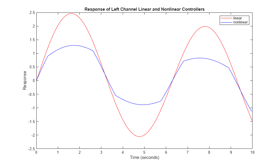 figure('Tag','CloseMe'); plot(lcSim.tout, youtl, 'r-', nlcSim.tout, youtnl, 'b-') title('Response of Left Channel Linear and Nonlinear Controllers'); ylabel('Response'); xlabel('Time (seconds)'); legend('linear','nonlinear')