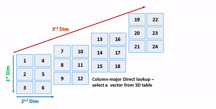 1. ブロック ColumnDLUT3DSelectVector/Direct Lookup Table (n-D) には 3 次元のテーブル データ "T3d = reshape([1:24], 3,2,4)" および値が "0" と "1" (両方とも 0 ベースのインデックス) の 2 つの入力端子があります。選択された出力ベクトルは、列優先アルゴリズムの T3d(:,1,2) (1 ベースのインデックス) です。同じモデル上の行優先アルゴリズムのセマンティクスを保持するには、同じインデックス端子の入力をもつ同じベクトルを選択し、テーブルを T3d_p = permute(T3d, [2,3,1]) として置換します。行優先アルゴリズムの場合、選択されるベクトルは T3d_p(1,2,:) です。