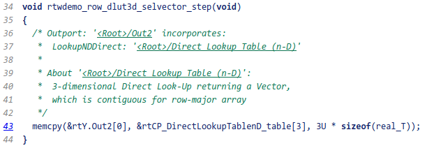 2. ColumnDLUT3DSelectVector で実行した手順を繰り返して、モデルのシミュレーションとコード生成を行います。3 次元テーブルから 2 次元行列を出力する行優先および列優先の直接ルックアップ アルゴリズムを次に示します。