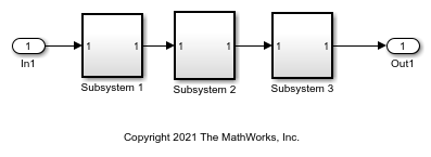 3. コードの再利用のサブシステム関数を有効にするには、参照モデルに Signal Conversion ブロックを挿入します。Inport と Subsystem 1 の間に 1 つのブロック、Subsystem 3 と Outport の間にもう 1 つのブロックを配置します。