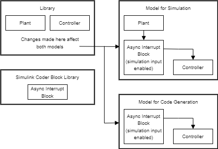 When developing a real-time system that includes ISRs, consider using a dual-model approach. Develop one model that includes a plant and a controller for simulation, and another model that includes only the controller for code generation. By using a Simulink library, you can implement changes to both models simultaneously. This figure shows how changes made to the plant or controller, both of which are in a library, are propagated to the models.