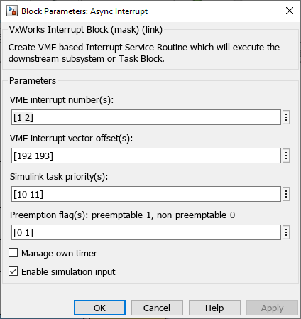 The Async Interrupt block does not configure the hardware that generates the interrupt. Typically, the interrupt source is a VME I/O board, which generates interrupts for specific events (for example, at the end of an analog-to-digital conversion). You set up the VME interrupt level and vector in registers or by using jumpers on the board. You can use the mdlStart routine of a user-written device driver (S-function) to set up the registers and enable interrupt generation on the board. You must match the interrupt level and vector specified in the Async Interrupt block parameter dialog box to the level and vector set up on the I/O board.