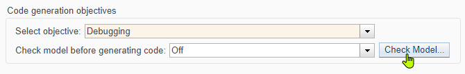 オプションで、[コード生成の目的] セクションのパラメーター [目的を選択] を [実行効率性] または [デバッグ] に設定します。次に、目的に適したパラメーターを特定して体系的に変更するには、[モデルのチェック...] をクリックします。