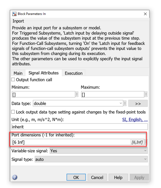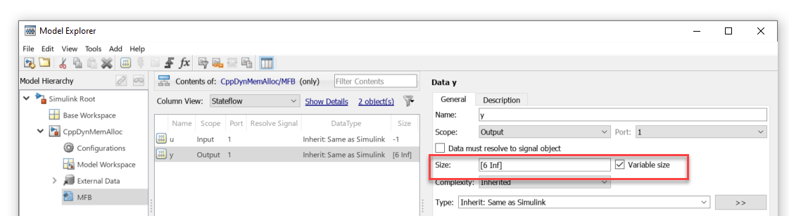 MFB. The second dimension of the Size parameter for the output port is set toInf. The Support variable-size arrays parameter for the block and the Variable size parameter for the relevant port are selected.