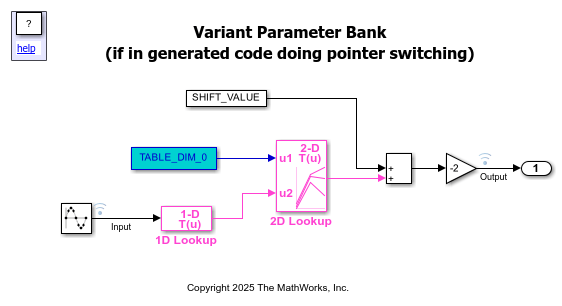 slexVariantParameterBankWithSLDDcontains multiple blocks that use variant parameters defined in the data dictionarybankedVariantParameterData.sldd. The values of the Constant parameters of the two Constant blocks in the model are set to the variant parameter objectsSHIFT_VALUEandTABLE_DIM_0. The Table data and Breakpoint sets of the n-D Lookup Table blocks are specified using the variant parameter objectsT1Break,T1Data,T2Break, andT2Data.