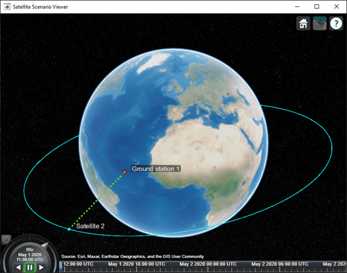 startTime = datetime(2020,6,02,8,23,0); stopTime = startTime + days(1); sampleTime = 60; sc = satelliteScenario(startTime,stopTime,sampleTime);