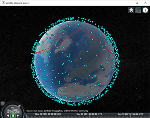 v = satelliteScenarioViewer(sc,"ShowDetails",false); sat.MarkerSize = 6; % Pixels campos(v,60,5); % Latitude and longitude in degrees