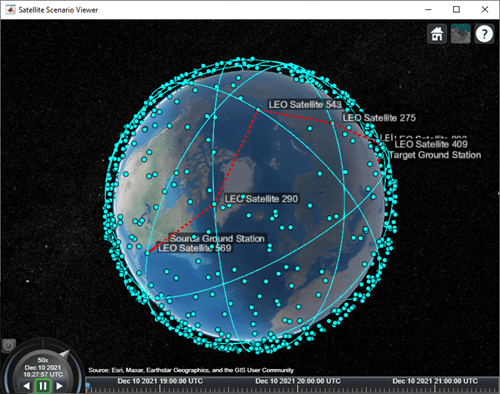 この例では、2 つの地上局間のアクセスを得るために、1,000 個の低軌道 ( LEO)衛星で構成される大規模なコンスタレーションを通過する経路を決定する方法を示します。続いて、このパスを使用できる次の 3 時間の間隔を計算する方法を示します。