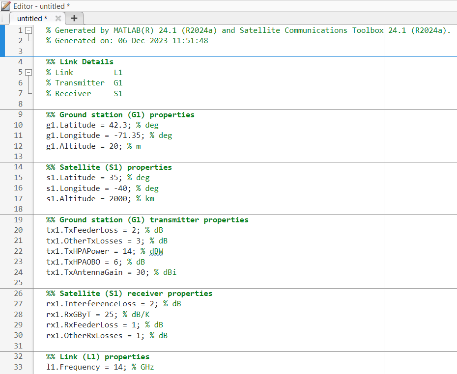 この図は、衛星リンク バジェット アナライザーアプリによって生成されたスクリプトの一部を示しています。