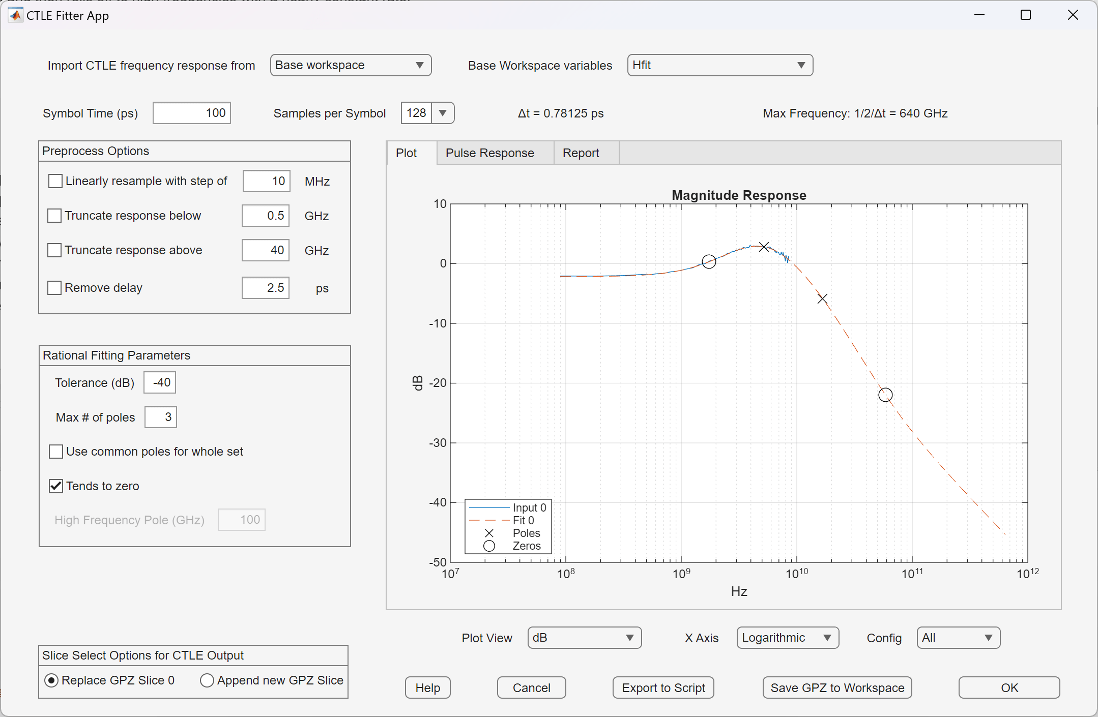 With the estimated (and noisy) peaking filter transfer function, use the rational fit methodology by using the CTLE Fitter app and ctlefit object. The fitting process does not provide any noise filtering, so it is important to pre-process the frequency response by truncating at a frequency below the first null in the response. When applying this methodology to modeling your own circuits, if you have access to an ac sweep simulation of the circuit, then a directly extracted peaking filter transfer function can replace the noise prone estimated peaking filter transfer function from time domain waveforms.
